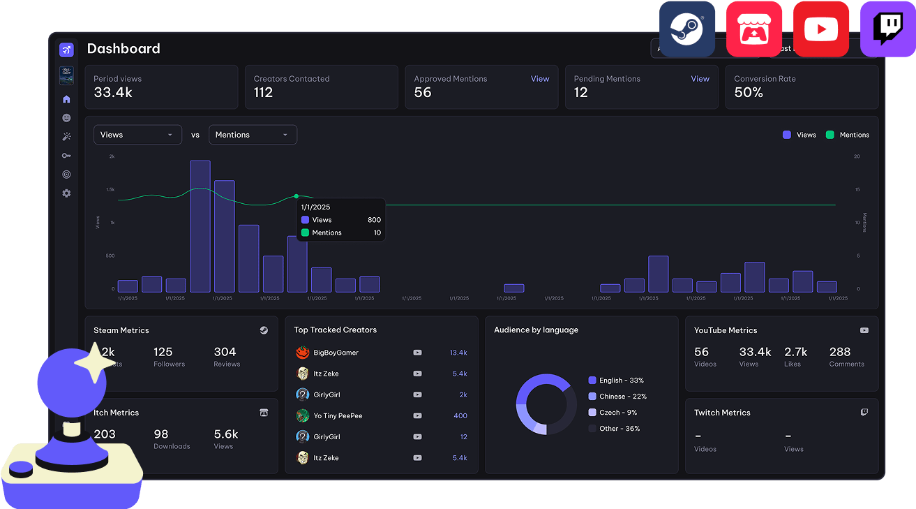 Letstrack is a simple solution for your game’s marketing - search creators, send keys, track mentions, and analyze store analytics in one place.