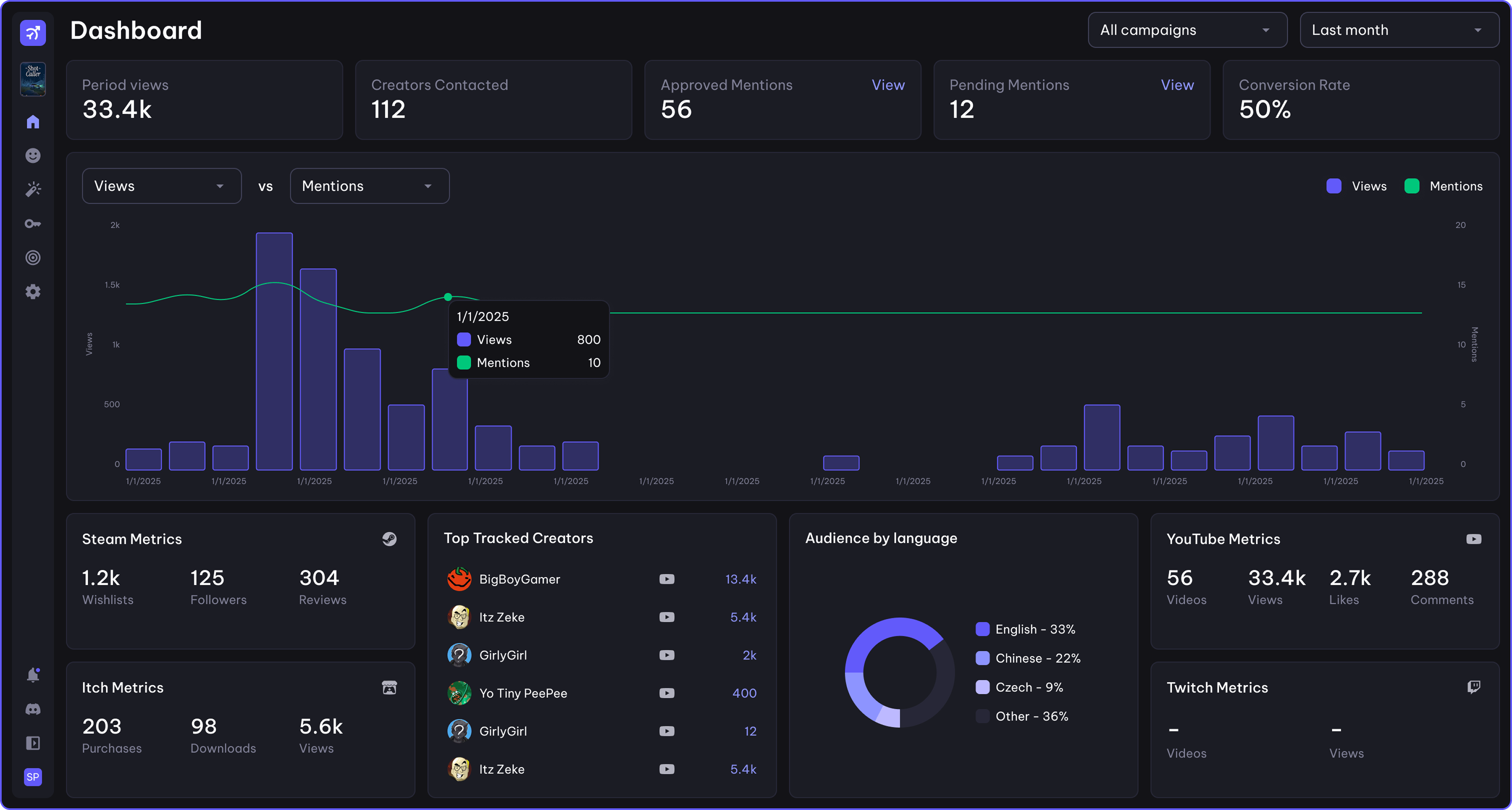 Connect your Steam and Itch.io pages to see your key metrics grow in one place, from the moment your store page is public.